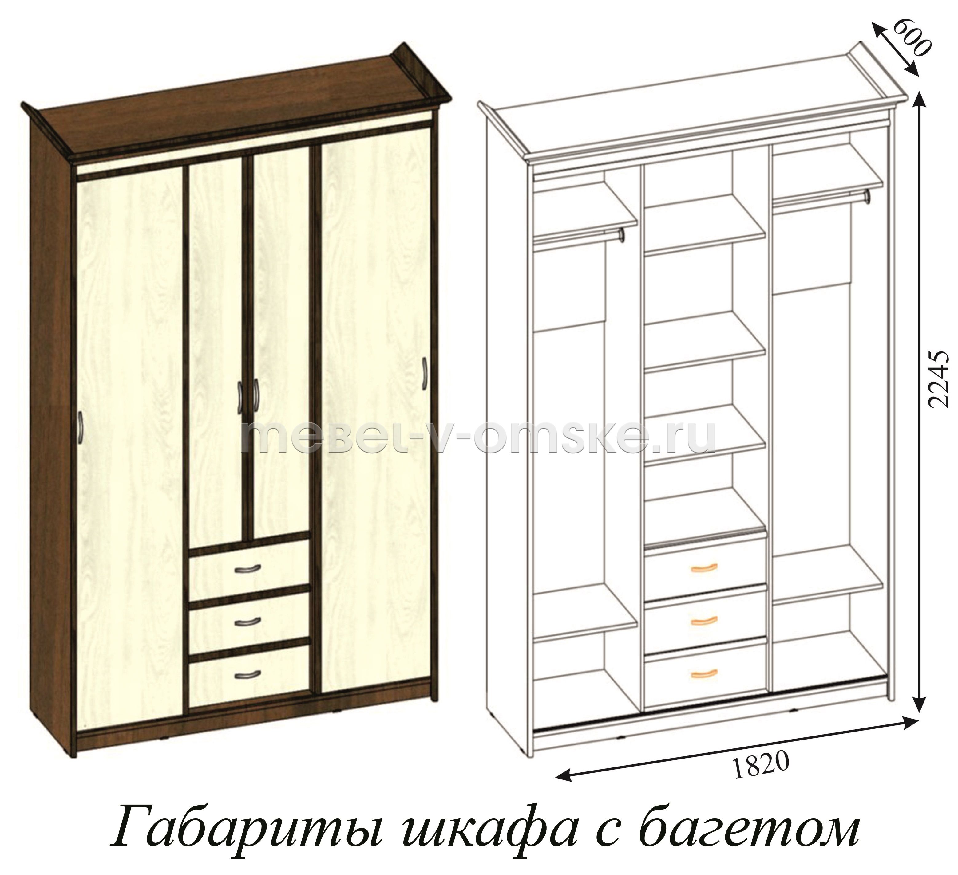 - Карниз. Шкаф возможно украсить карнизом - это профильная планка прикручивающаяся к крышке шкафа. Цвет карниза подбирается в цвет накладок МДФ на дверцах шкафа. Габарит шкафа с карнизом: 1820х2245х600. Обратите внимание! Если промежуток между шкафом и потолком менее 35 см - установить карниз нет возможности. Карниз приобретается отдельно, для комплектации пройдите по ссылке "Багет-профиль EL17".