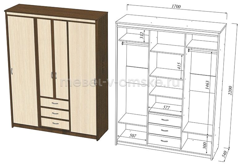 Ширина габаритная1700 ммВысота габаритная2200 ммГлубина габаритная540 ммУгловойнетТип дверейраздвижные (купе)Число дверей4Материал фасадовЛДСП + МДФДекор фасадовпрофиль МДФВыдвижные ящикиестьТип направляющих в ящикахроликовыеШтангастандартнаяМатериал корпусаЛДСПЗеркалонетВес173 кгКоличество упаковок4 штПоставкав разобранном видеПроизводствоОмскГарантия12 месяцев -