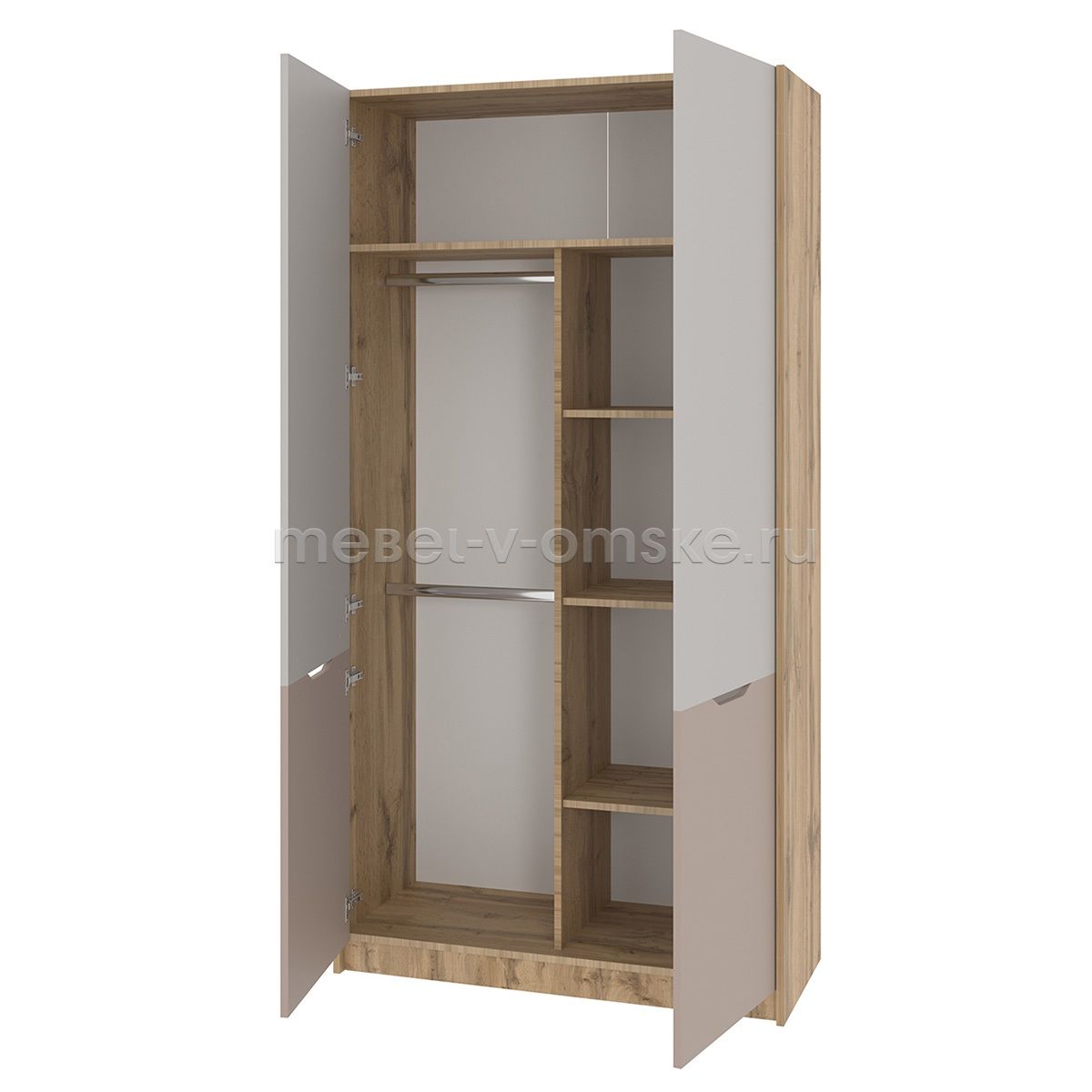 - Функционал. По умолчанию шкаф оснащен двумя штангами для плечиков и полкой над ними, а сдругой стороны съемными полками.