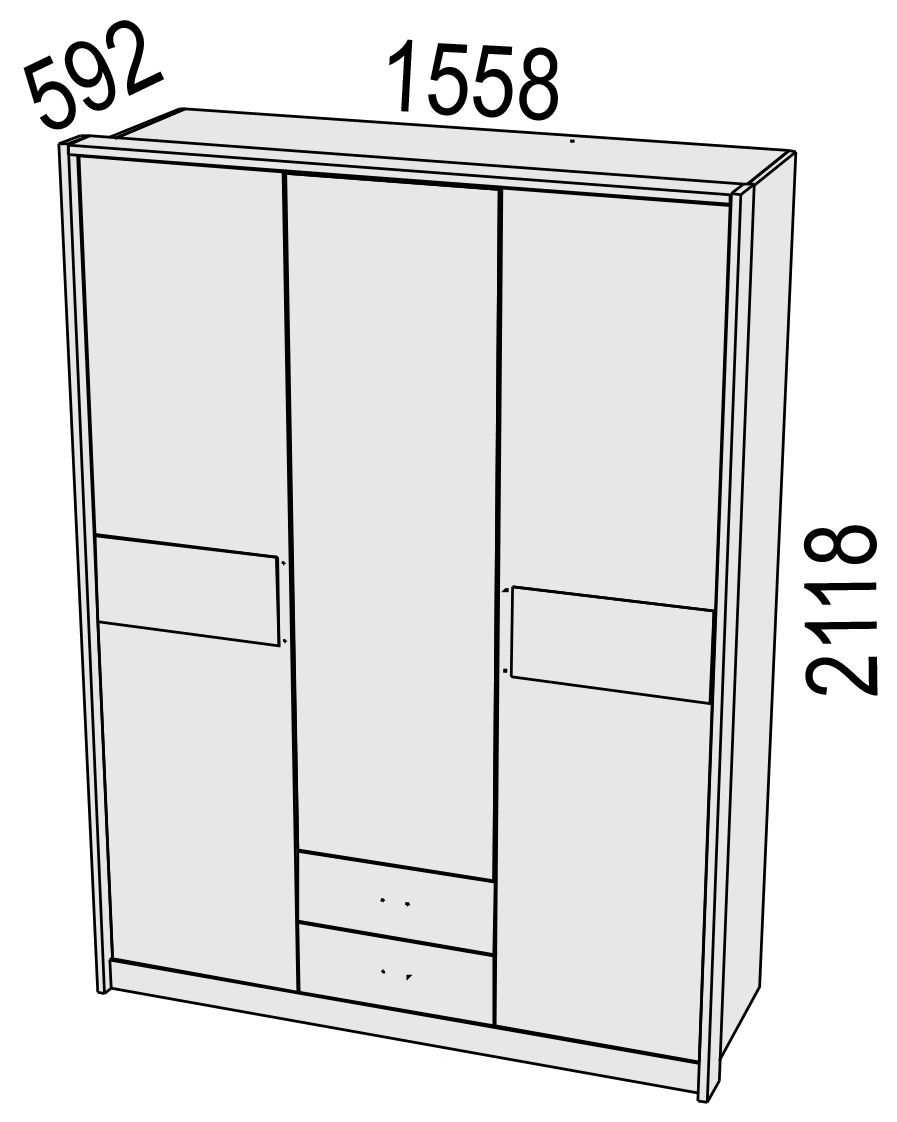 Ширина габаритная1558 ммВысота габаритная2118 ммГлубина габаритная592 ммУгловойнетТип дверейраспашныеЧисло дверей3Материал фасадовЛДСП + зеркалоДекор фасадовстекло с фотопечатьюВыдвижные ящикиестьТип направляющих в ящикахроликовыеШтангастандартнаяМатериал корпусаЛДСПЗеркалоестьВес170.1 кгОбъем упаковок0.3 м³Количество упаковок4 штПоставкав разобранном видеПроизводствоОмскГарантия24 месяца -