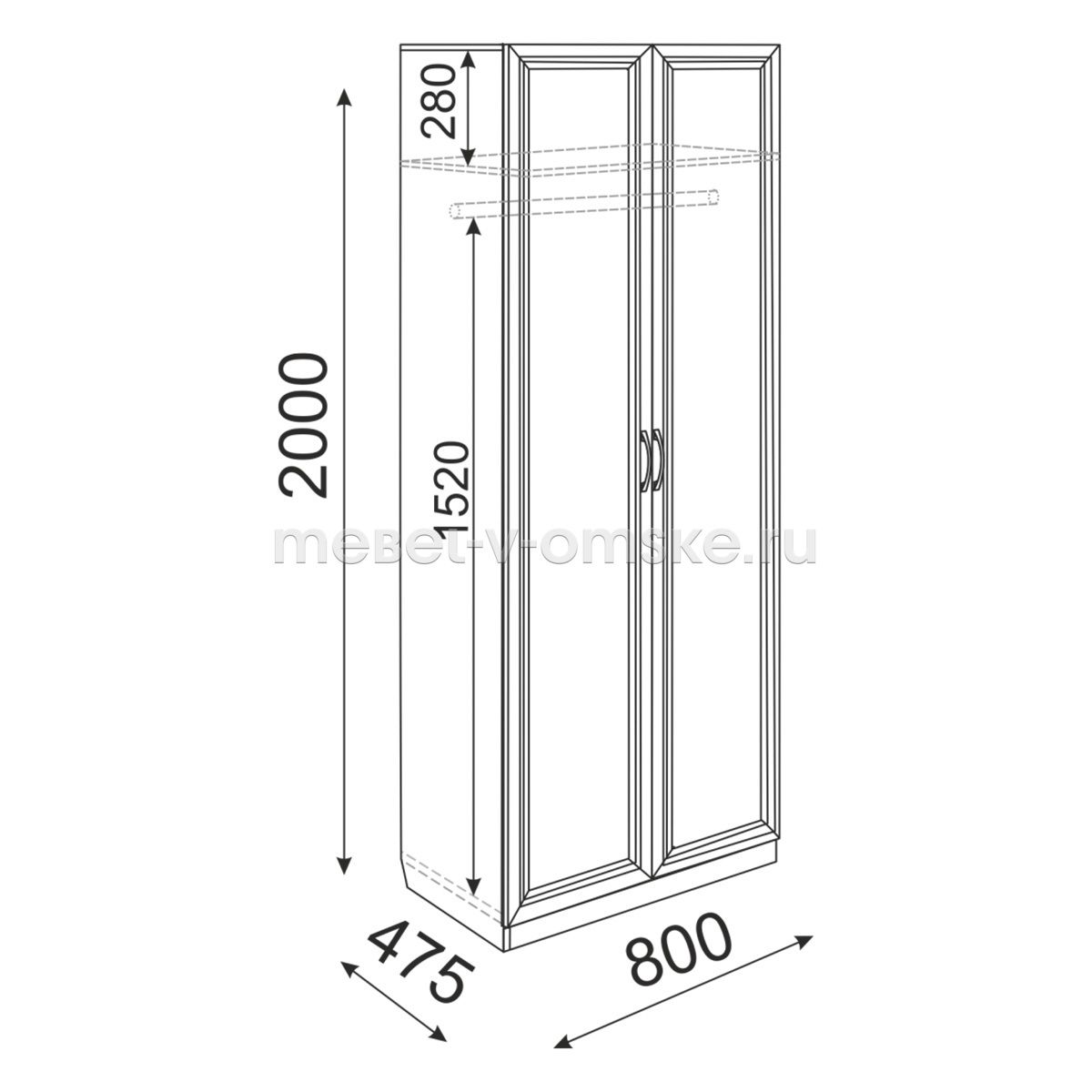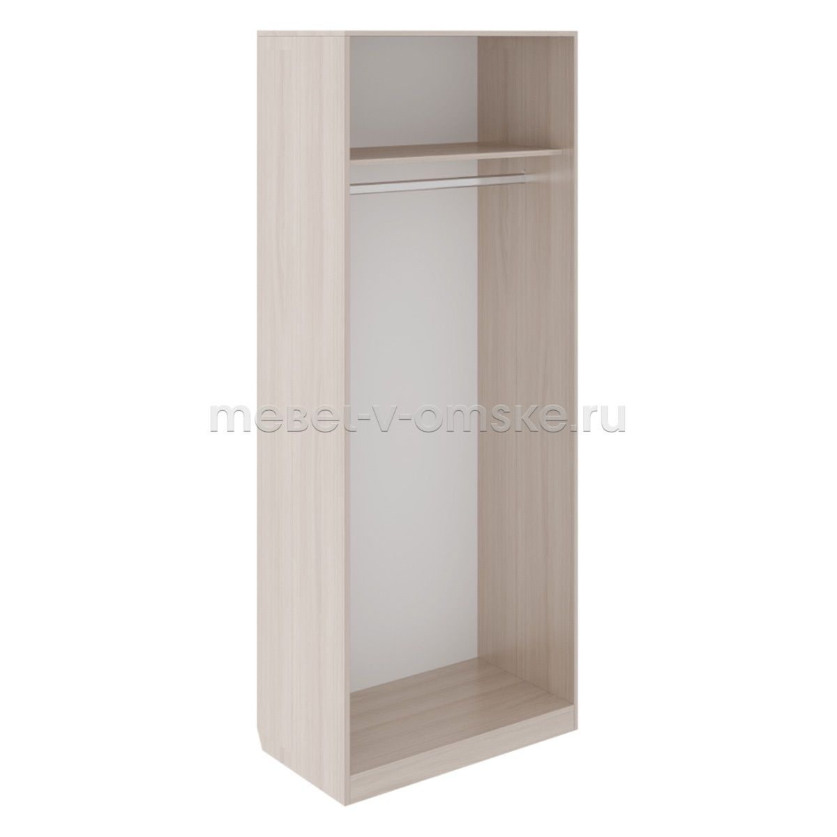 - Внутренние наполнение. Шкаф имеет отделение со штангой для вещей на вешалках и полку над ней. Высота полки 280 мм.