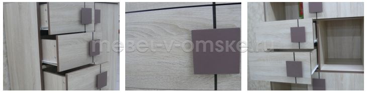 - Интересный современный дизайн – модель в цвете Дуб Сонома по фактуре смотрится как настоящая древесина, её тёплый светлый оттенок эффектно сочетается с квадратными тёмными ручками и кромкой ПВХ в шоколадной расцветке.
