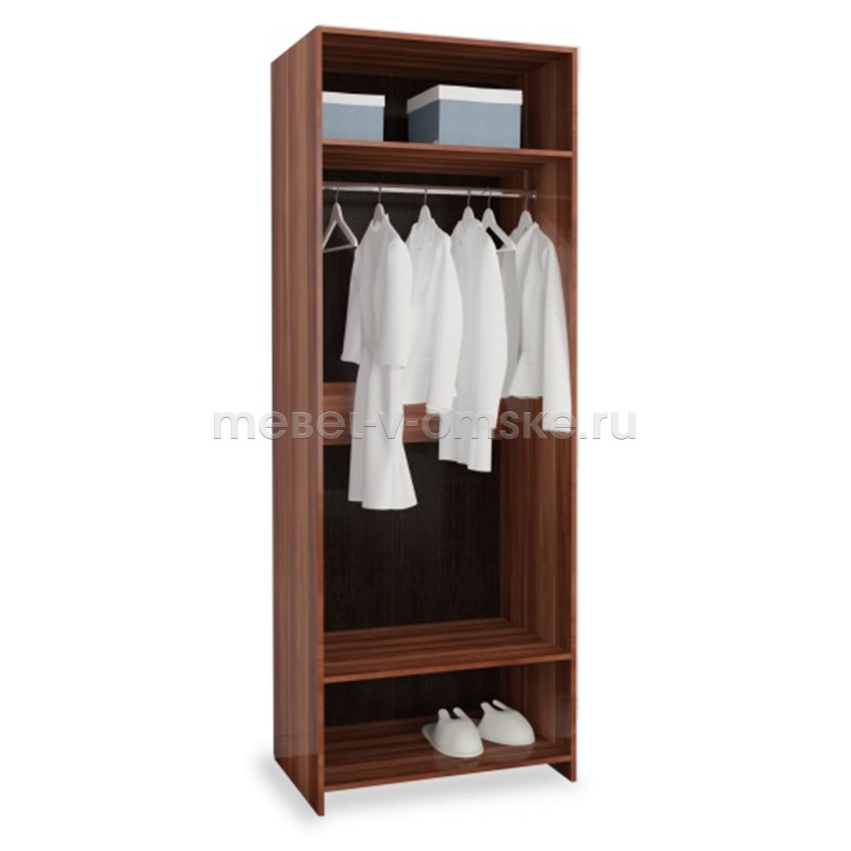 - Функциональность – платяной шкаф оборудован штангой для одежды на плечиках, антресольной полкой для головных уборов и нижней полкой.