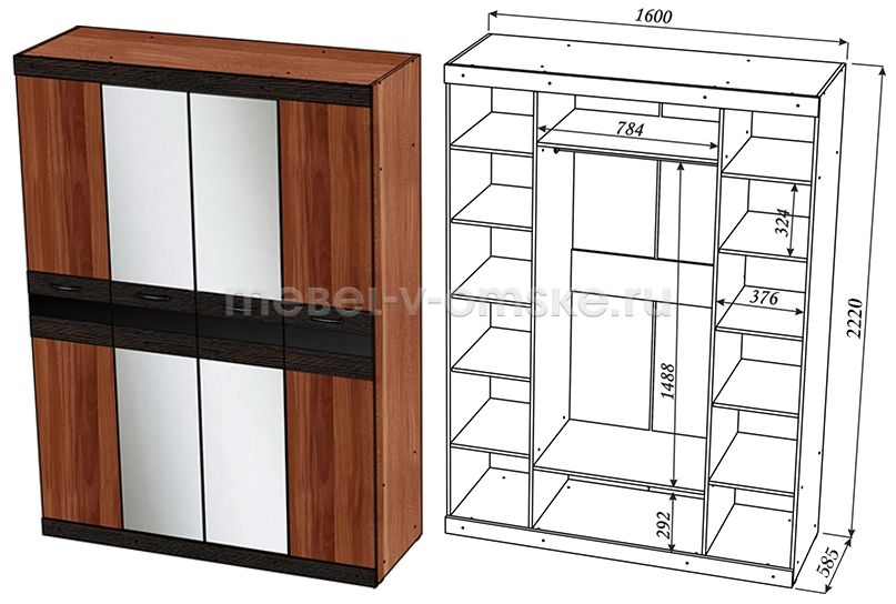 Ширина габаритная1600 ммВысота габаритная2220 ммГлубина габаритная585 ммУгловойнетТип дверейраспашныеЧисло дверей4Материал фасадовЛДСП + МДФ + зеркалоДекор фасадовстеклянные вставкиВыдвижные ящикинетШтангастандартнаяМатериал корпусаЛДСПЗеркалоестьВес229 кгКоличество упаковок5 штПоставкав разобранном видеПроизводствоОмскГарантия12 месяцев -