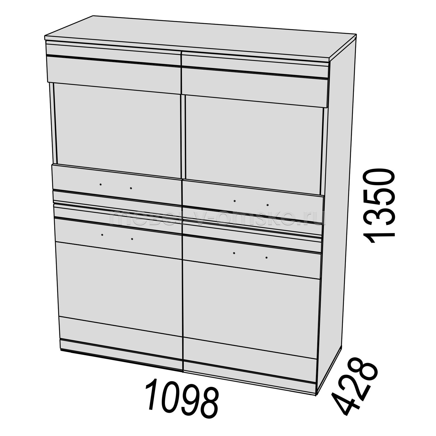 Ширина габаритная1098 ммВысота габаритная1350 ммГлубина габаритная428 ммУгловойнетТип дверейраспашныеЧисло дверей4Материал фасадовЛДСП + МДФ + стеклоДекор фасадовфрезеровкаВыдвижные ящикинетШтанганетМатериал корпусаЛДСПЗеркалонетВес77.75 кгОбъем упаковок0.15 м³Количество упаковок3 штПоставкав разобранном видеПроизводствоОмскГарантия24 месяца -
