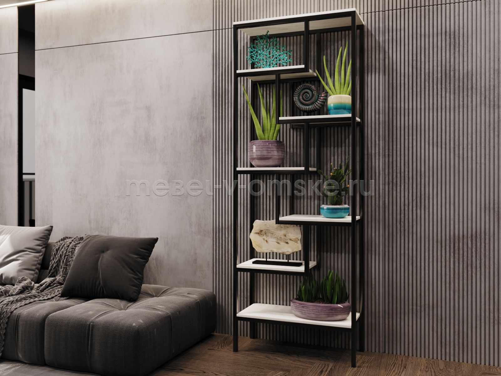 Стеллаж Сл003 станет удачным дополнением интерьера в стиле лофт, визуально не загромождая пространство.