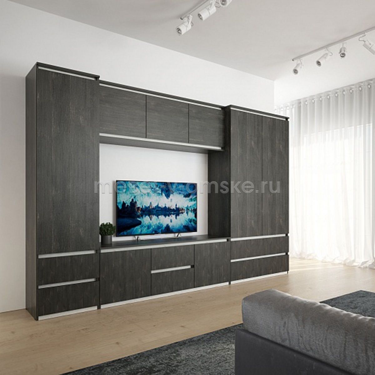 - Конструктив. Стенка включает в себя пенал с полками и ящиками, шкаф с полками и ящиками, тумбу ТВ и навесную полку.