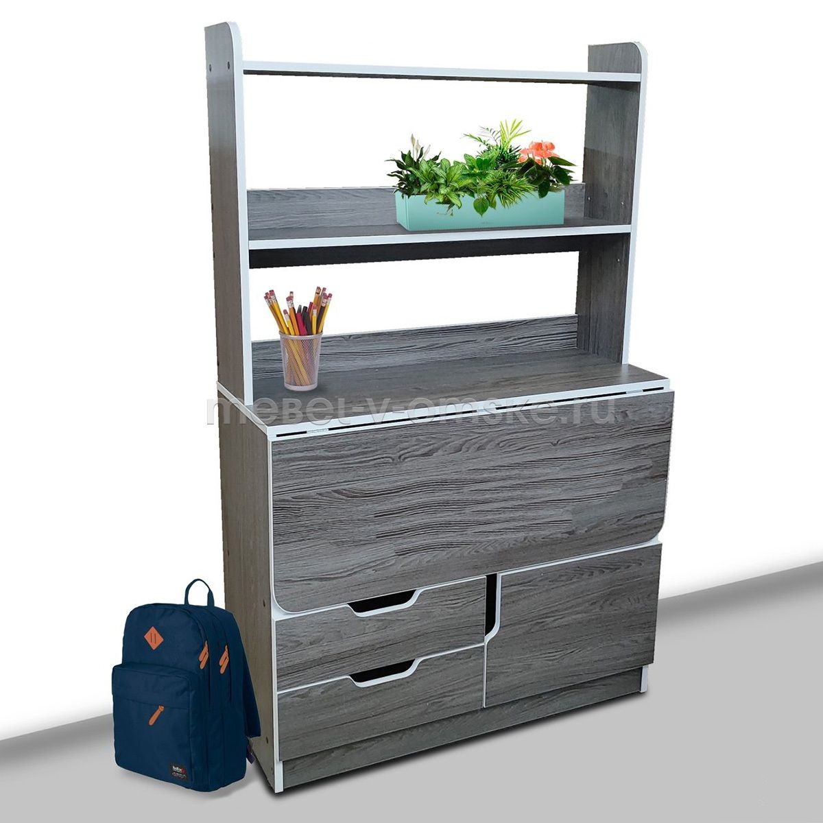- Функциональность. Стол имеет раскладную столешницу 900*700 мм, два выдвижных ящика в основании и нишу за распашной дверью, так же при раскладывании столешницы под ней образуется большая открытая ниша. Над столешницей организована открытая зона хранения в виде двух полок. Трансформация стола позволяет оптимизировать использование пространства, что соответствует принципам эргономики.