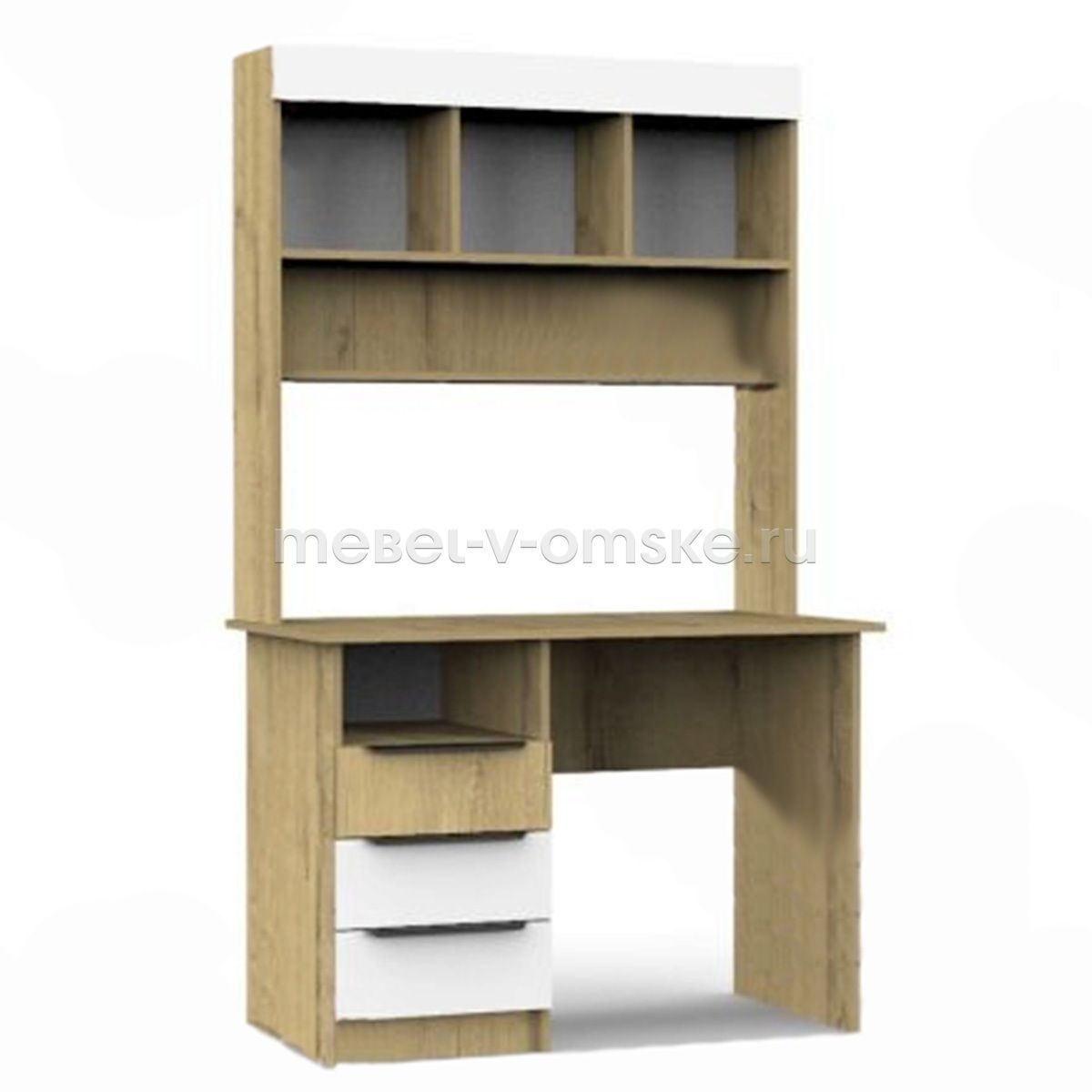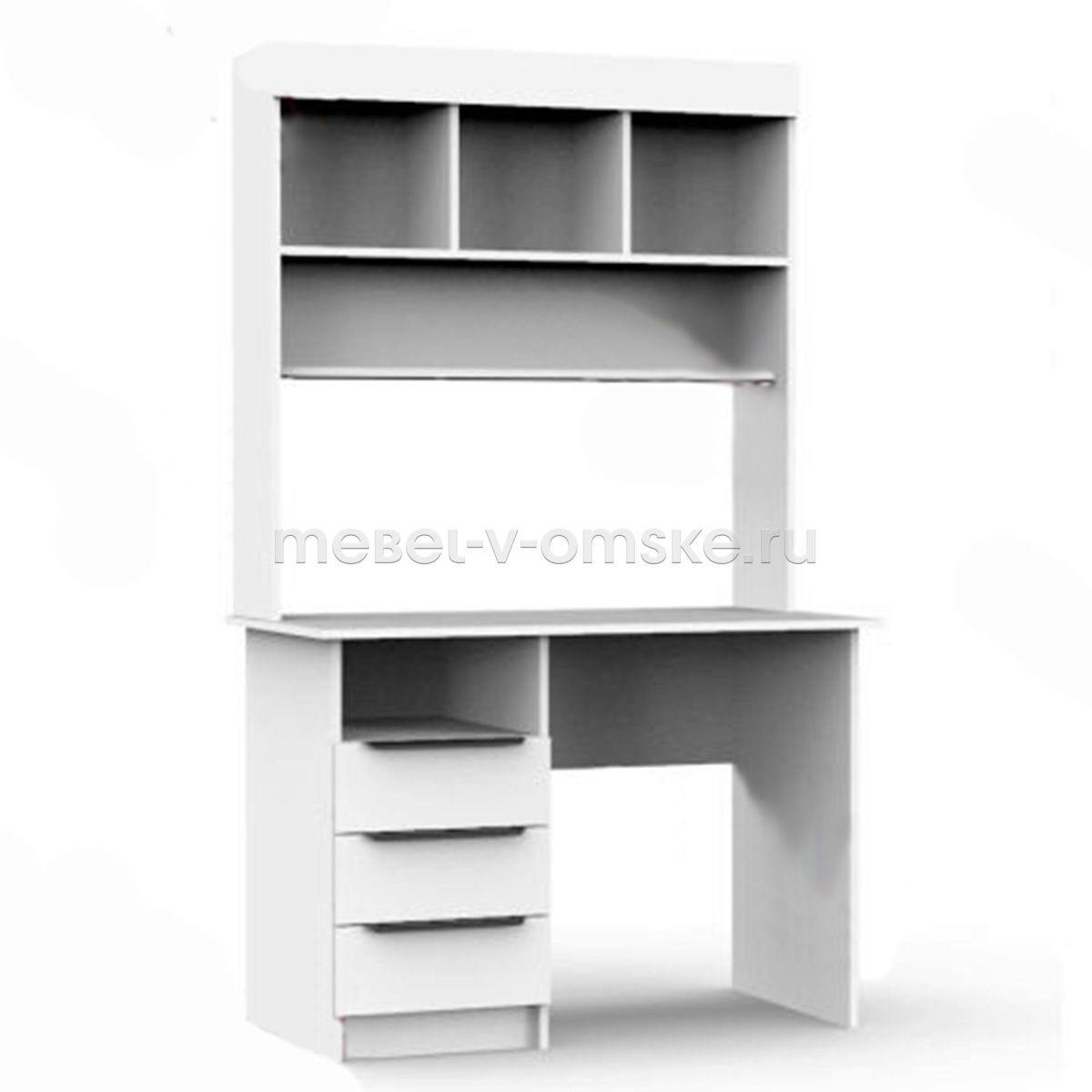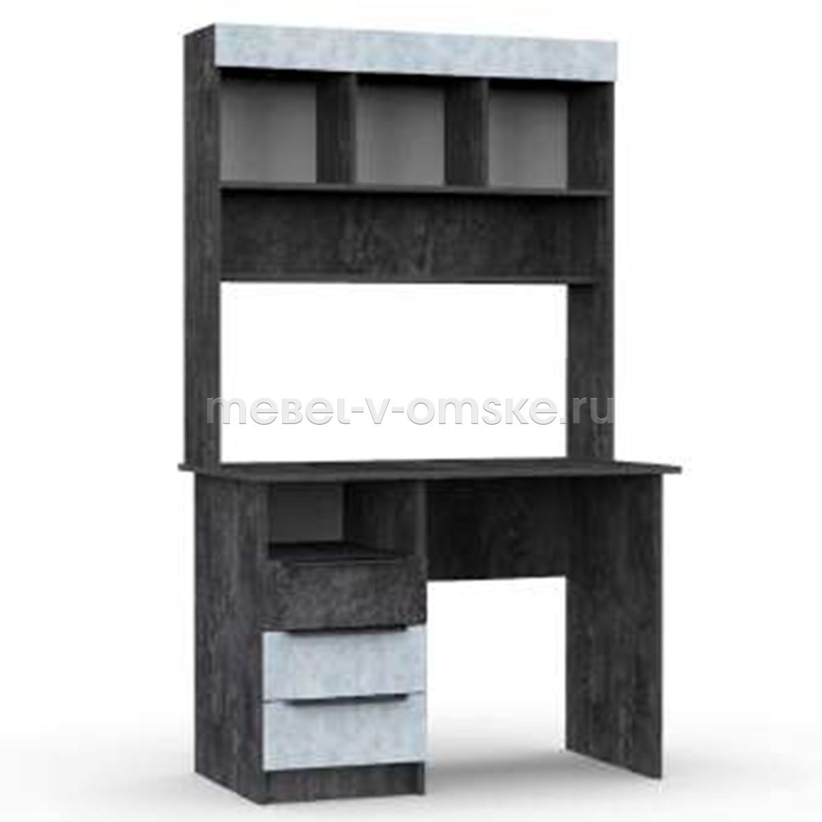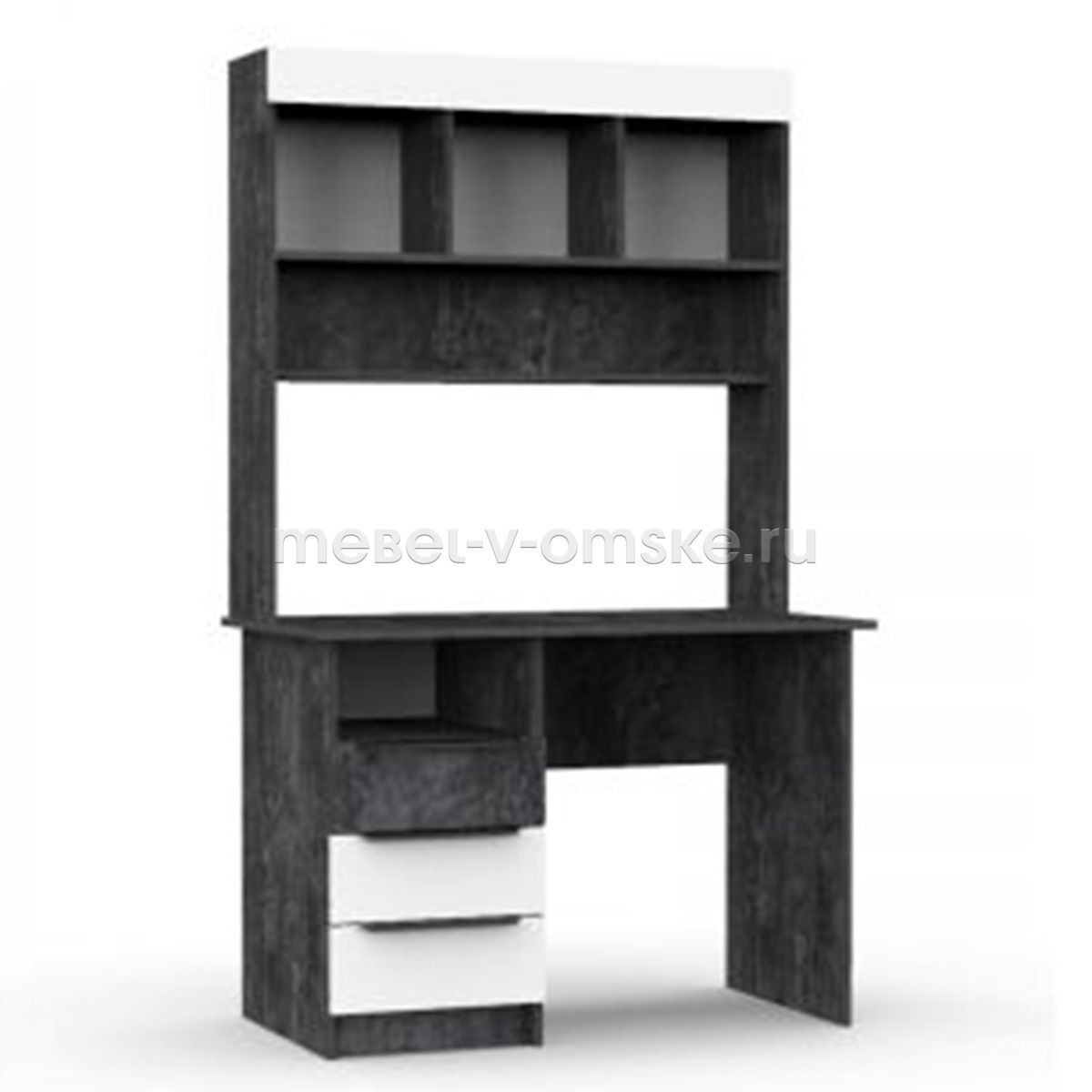 - Конструктив. Стол оснащен столешницей 1070х590 мм., надстройка включает в себя три открытые ниши для хранения. Под столешницей стол имеет тумбу с открытой нишей и тремя выдвижными ящиками.