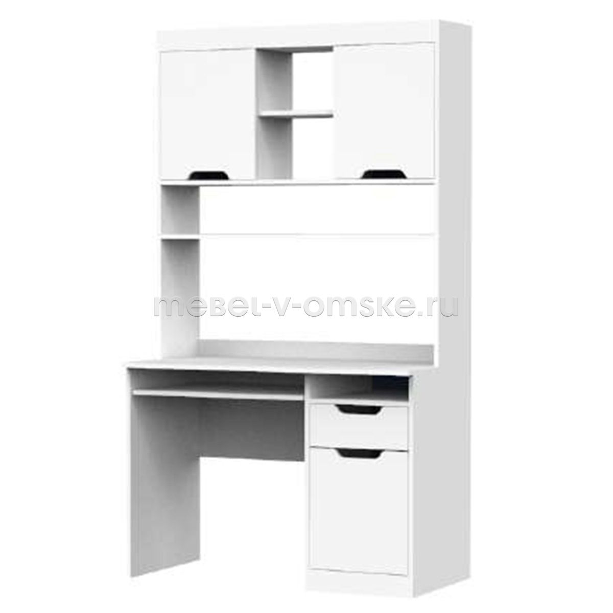 - Конструктив. Стол включает в себя широкую столешницу 1100*560 мм. Открытую полку под столешницей, тумбу с открытой нишей, ящиком и поками за распашной дверью. Верх стола оснащен надстройкой с закрытыми и открытыми полками для хранения.