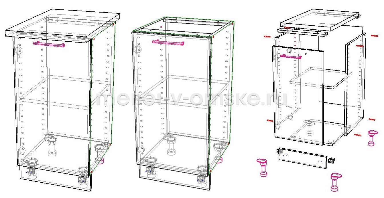 Габариты. Столешницы не входят в стоимость модуля и комплектутся отдельно. Как именно Вам нужно распилить столешницу - напишите в комментарии при заказе кухни, и наши продавцы свяжутся с вами. На ваш выбор столешницы толщиной 26 мм. и 38 мм.