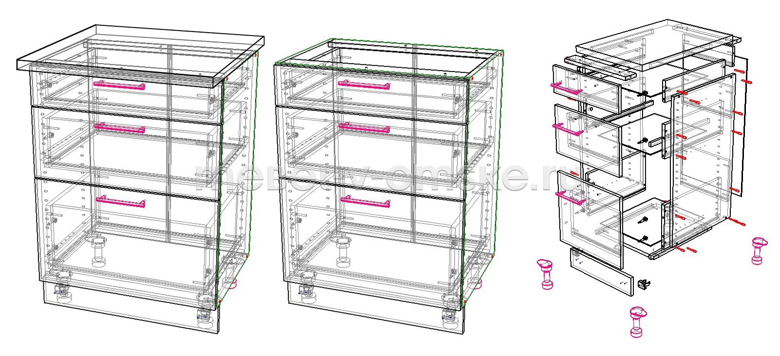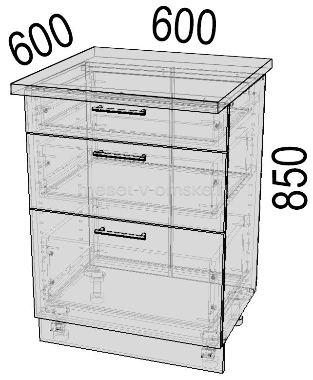 Габариты. Столешницы не входят в стоимость модуля и комплектутся отдельно. Как именно Вам нужно распилить столешницу - напишите в комментарии при заказе кухни, и наши продавцы свяжутся с вами. На ваш выбор столешницы толщиной 26 мм. и 38 мм.