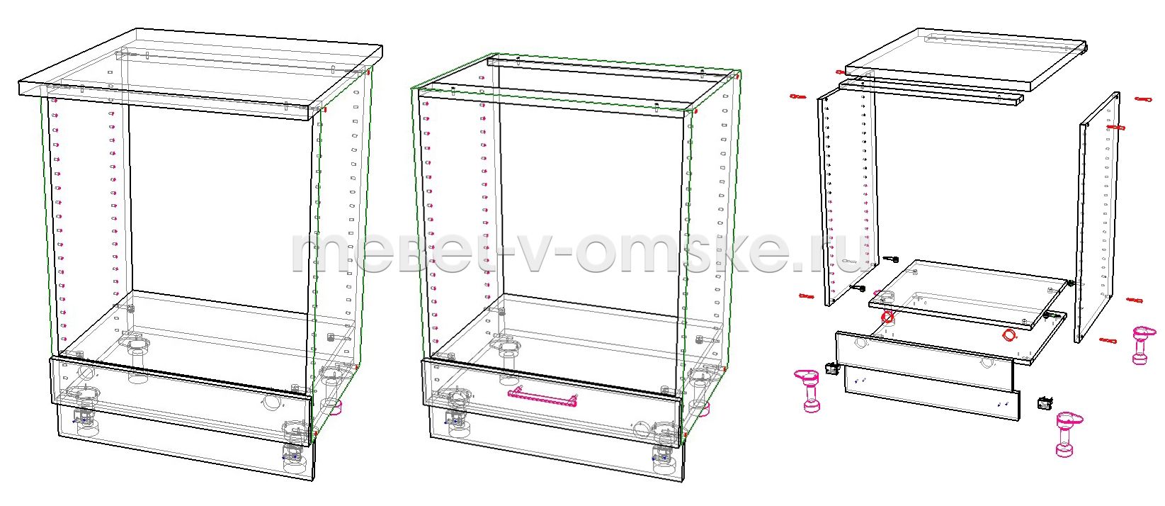 Габариты. Столешницы не входят в стоимость модуля и комплектутся отдельно. Как именно Вам нужно распилить столешницу - напишите в комментарии при заказе кухни, и наши продавцы свяжутся с вами. На ваш выбор столешницы толщиной 26 мм. и 38 мм.