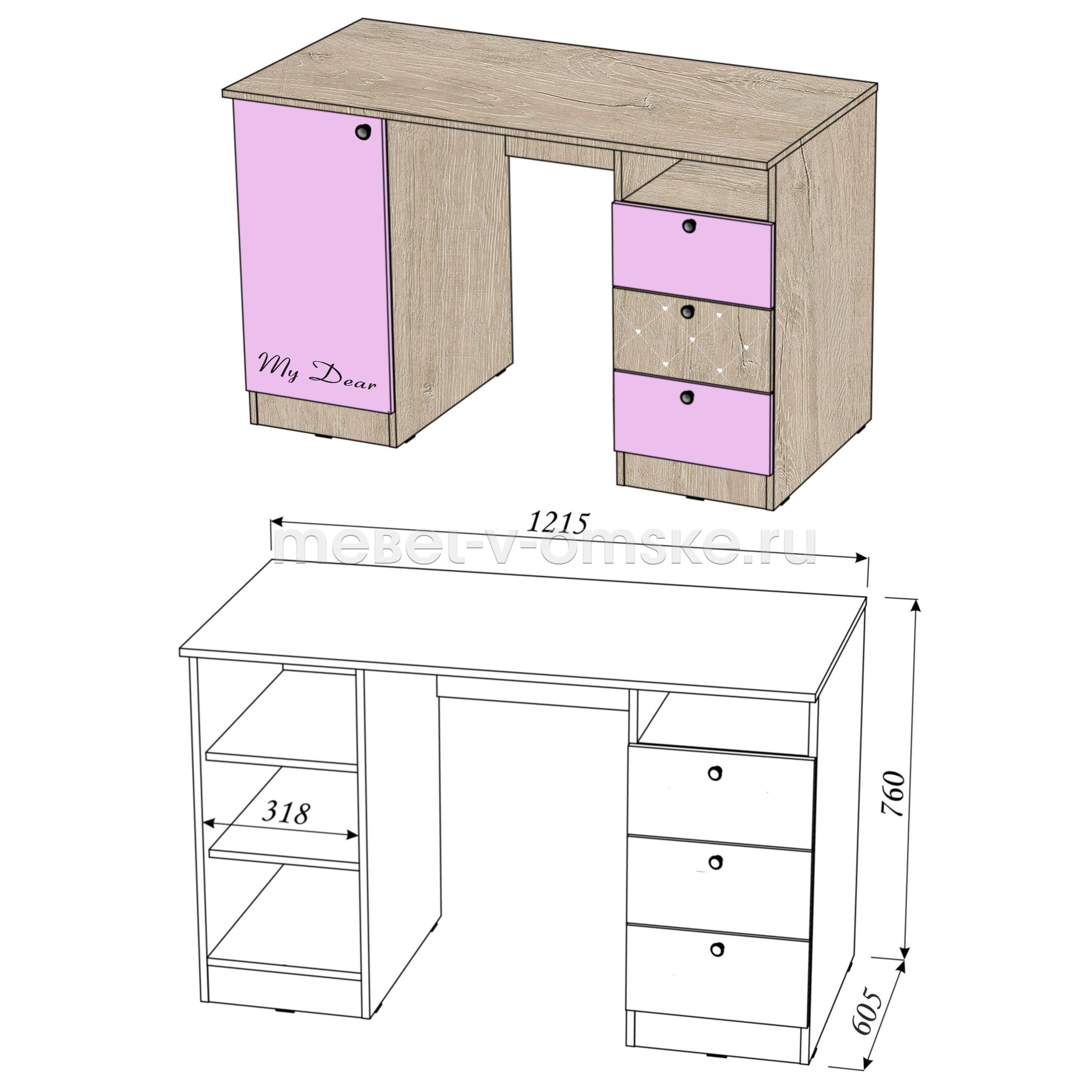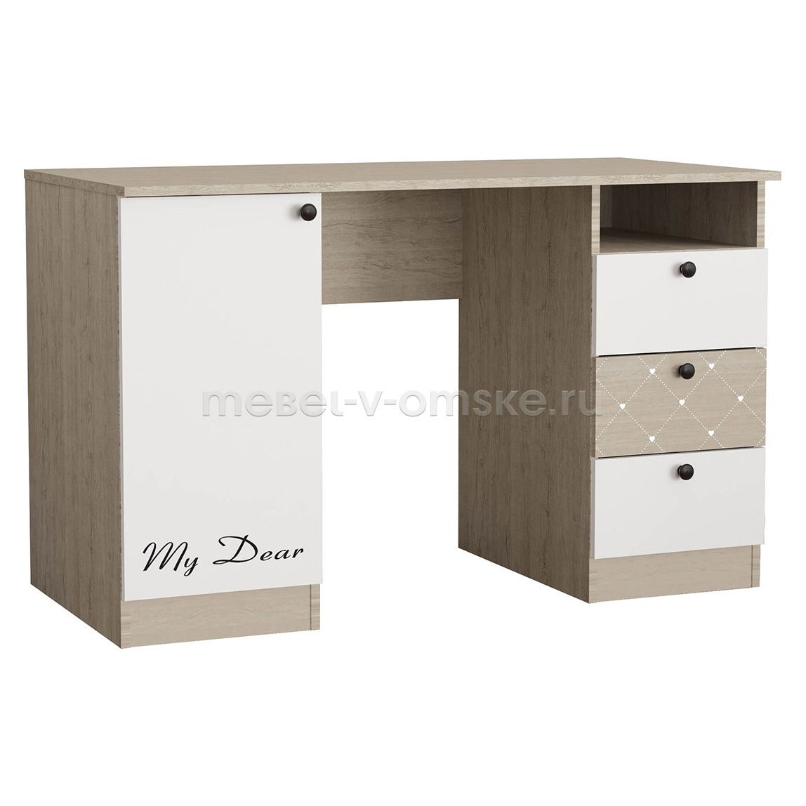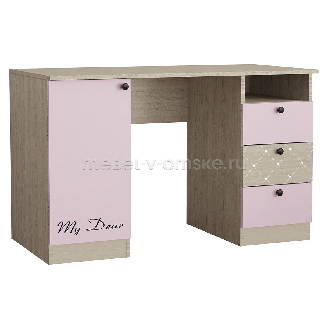 - Функциональность.Стол оснащен тумбой с 3 выкатными ящиками и открытой нишей над ними, так же 3 полками за распашной дверцей.