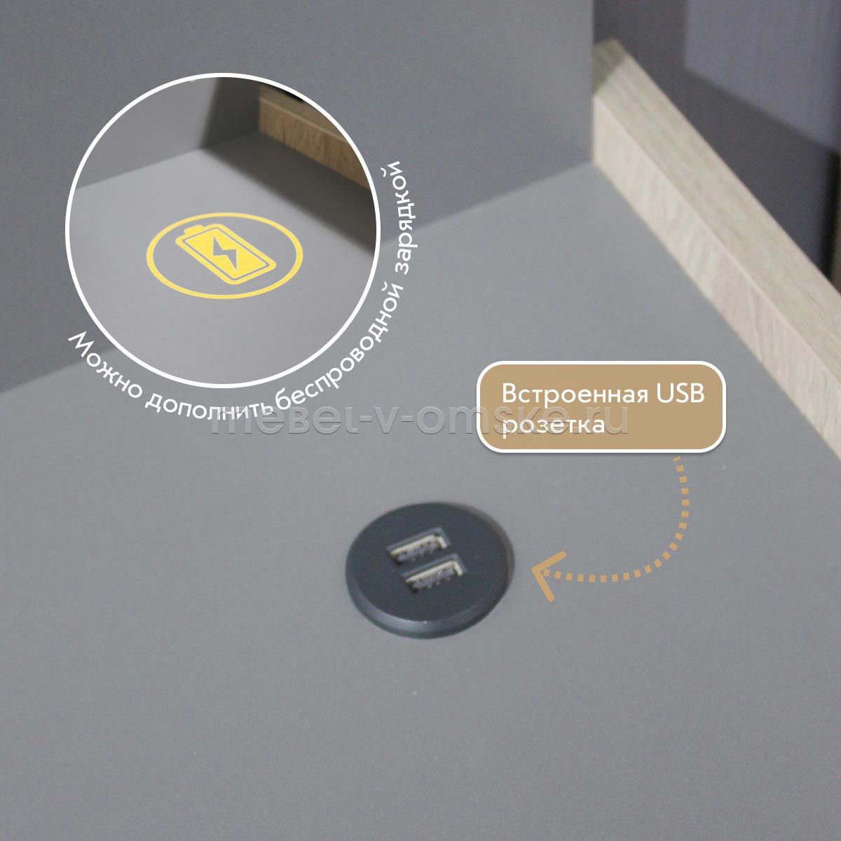 - Конструктив: Просторная столешница (1200*600 мм) предоставляет достаточно места для учебы и творчества. Выдвижной ящик, расположенный под столешницей, и две открытые ниши по бокам обеспечивают удобное хранение необходимых вещей. Интегрированное USB-устройство готово в любой момент подзарядить гаджеты, а возможность установки беспроводной зарядки добавляет современности.
