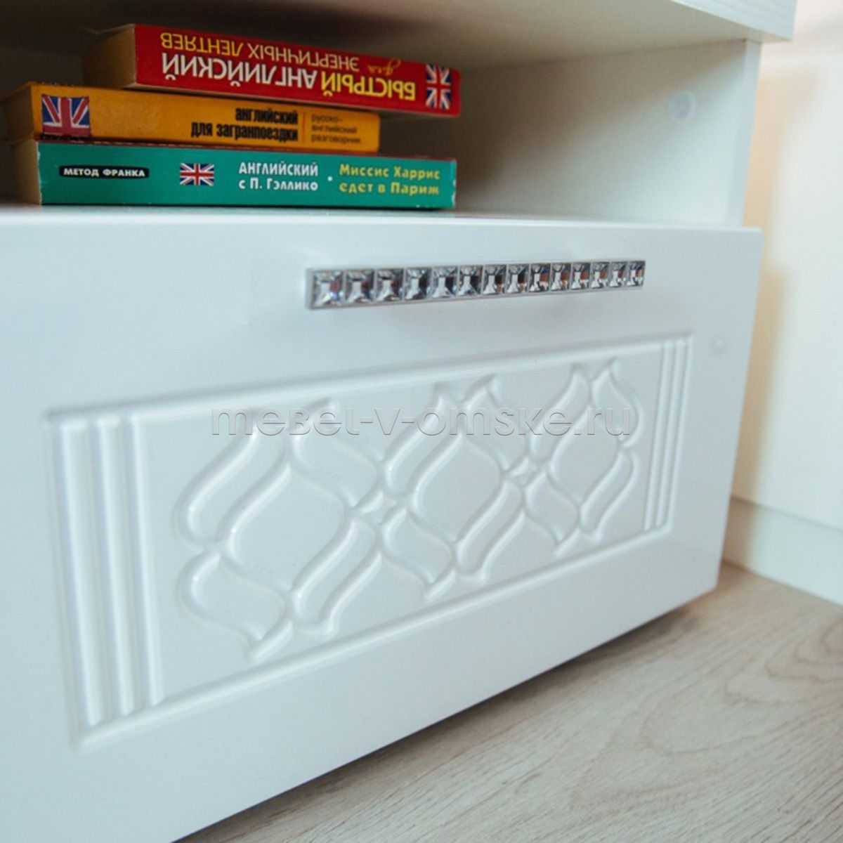 - Фурнитура. Прямоугольные опоры, высотой 20 мм. Ручки металлические с Кристалами 96 мм. Направляющие шариковые 350 мм.