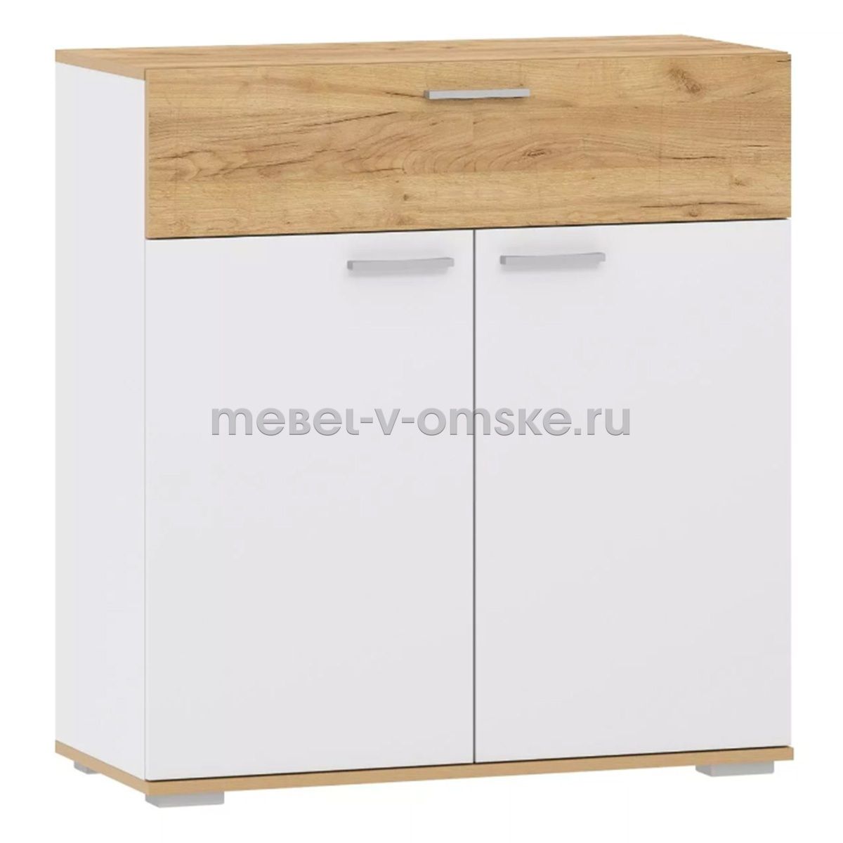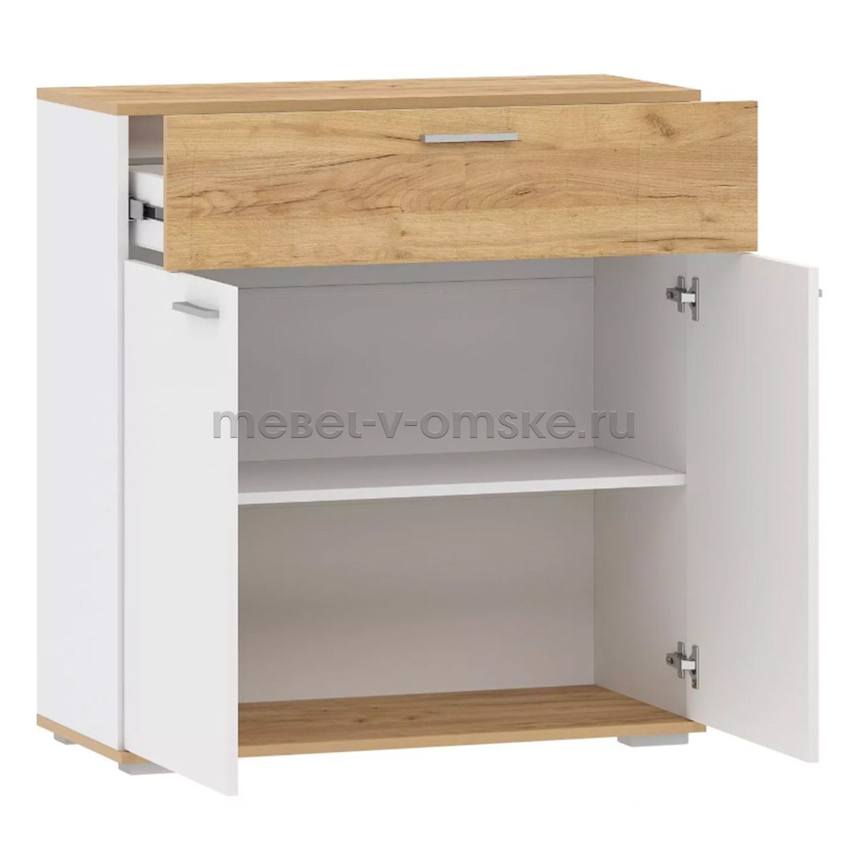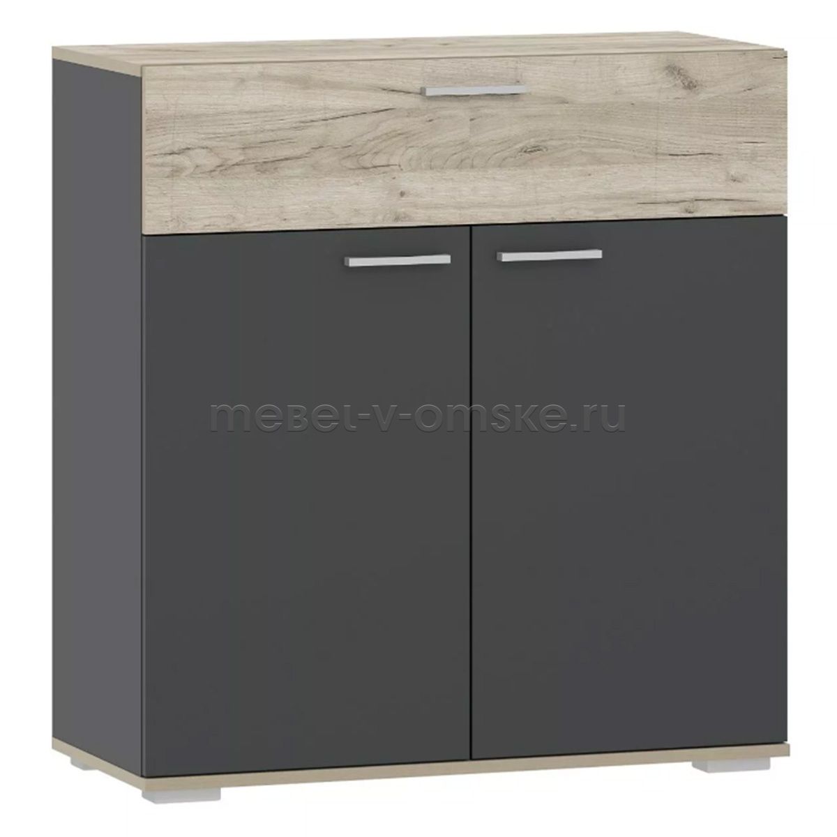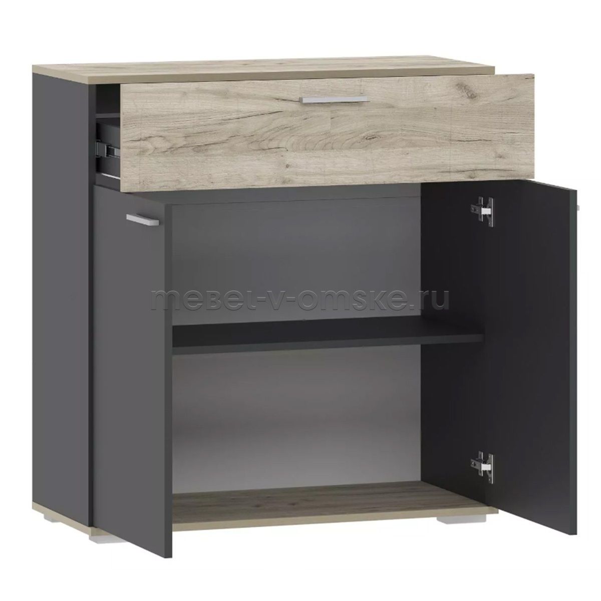 - Конструктив. Тумба оснащена выдвижным ящиком со встроенной перегородкой, который выдвигается плавно и бесшумно благодаря шариковым направляющим, а лаконичные ручки серого цвета подчеркивают стиль коллекции. За распашными дверьми - две полки, на которых удобно расположить все необходимые вещи.