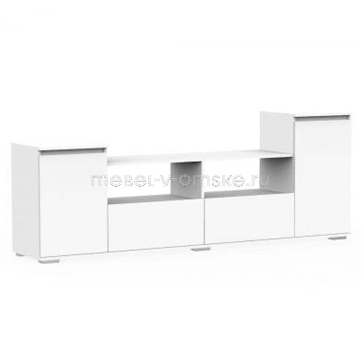 - Конструктив. Тумба имеет два выдвижных ящика по центру и открытые ниши над ними, по краям тумба оснащена двумя полками за распашными дверцами.