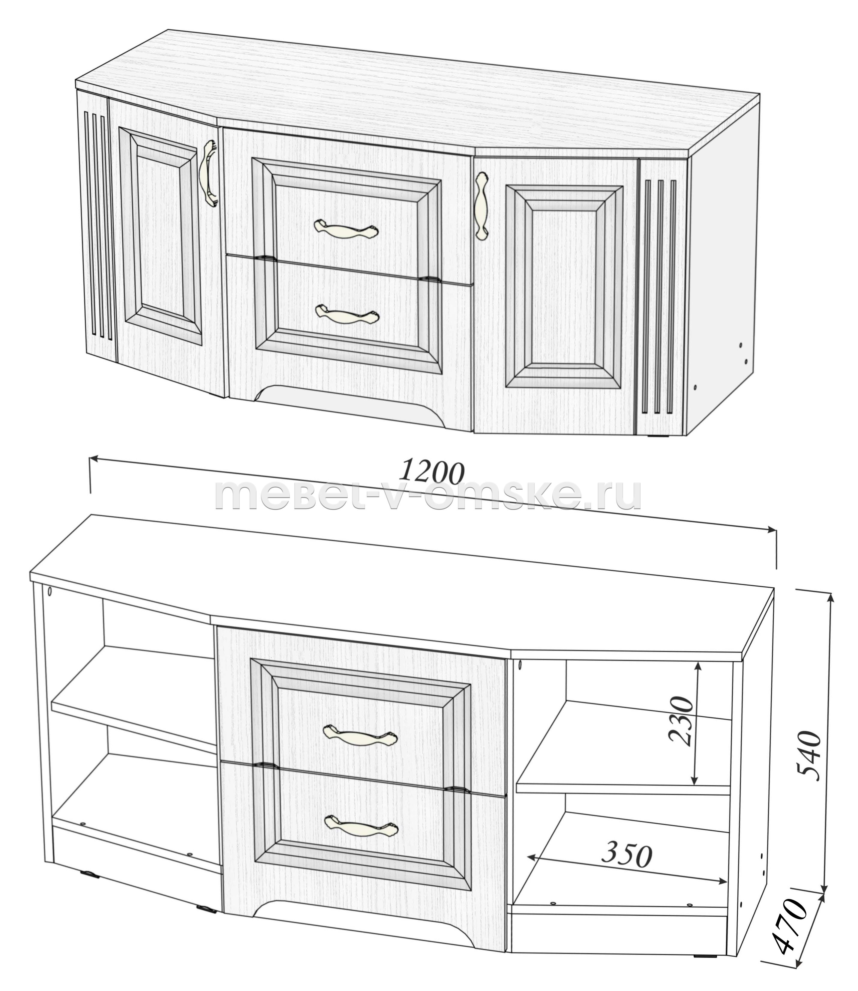 Особенности модели:- Вместительность – по центру тумбы располагаются два выдвижных ящика под всевозможные мелочи, по краям ниши с распашными дверцами с одной полочкой внутри каждой, в которых хозяева смогут хранить диски, книги, журналы и прочие необходимые под рукой предметы.