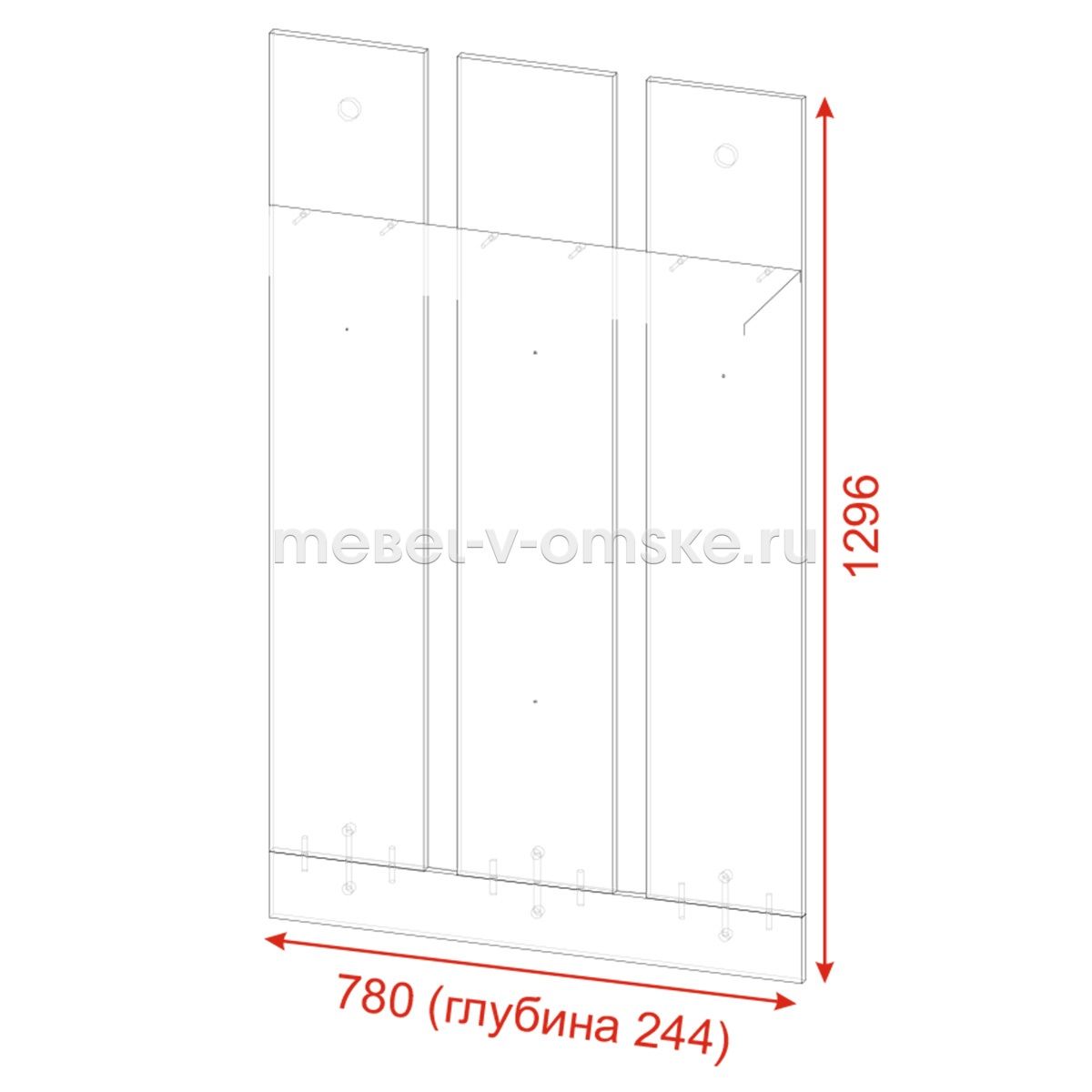 - Конструктив. Секция с вешалкой с тремя вертикальными щитовыми элементами с двумя крючками на каждом, с двумя задними горизонтальными брусками крепления за ними, с верхним горизонтальным щитовым элементом соединения в виде "Козырька".